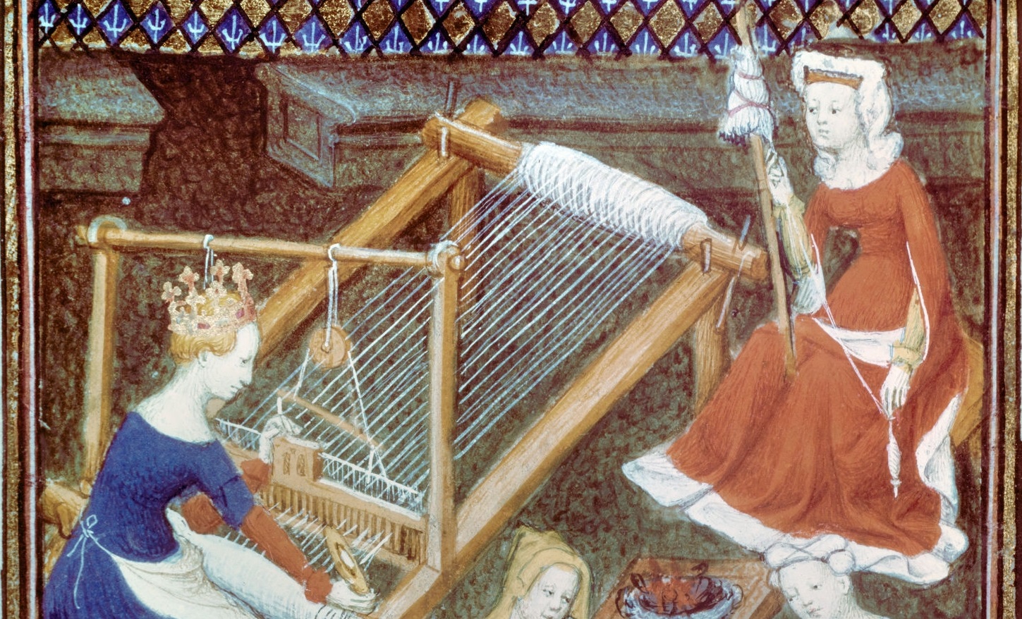 Kuva: Ms Fr 12420 fol. 71 Tanaquil weaving, from ”De Claris Mulieribus,” from the Works of Giovanni Boccaccio, 1402. Wikimedia Commons.