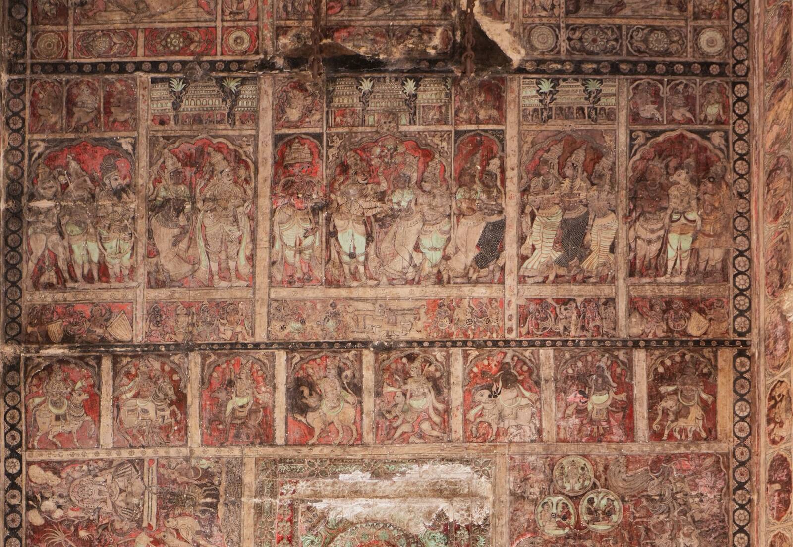 Kuva: Yksityiskohtia Virupakshan temppelin kattomaalauksista. Temppeli on osa Unescon maailmanperintökohdetta, Hampin monumentteja. Ingo Mehling, Wikimedia Commons.