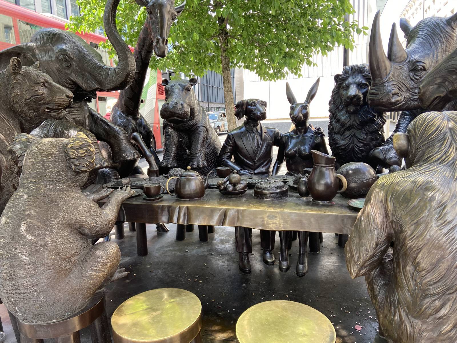 Viime viikolla näin Lontoon Paddingtonissa vaikuttavan eläinaiheisen katutaideteoksen nimeltä ”The Wild Table of Love” (2022). Tässä taiteilijapariskunta Gillien ja Marcin pronssiveistoksessa kymmenen erittäin uhanalaisen eläinlajin edustajaa on kokoontunut aterioimaan katetun pöydän ääreen. Teos on osa taiteilijoiden ”Love The Last” -projektia, jonka tavoitteena on aktivistisen julkisen taiteen avulla havahduttaa katsojat luonnon hätätilaan. Esittelytekstissä veistosta kuvataan lupaukseksi suojella lajeja sukupuutolta. Myös katsojaa pyydetään liittymään tähän rakkauden rinkiin istahtamalla hetkeksi pöydän tyhjälle tuolille ja julkaisemalla sosiaalisessa mediassa sisältöä tunnisteella #LoveTheLast.