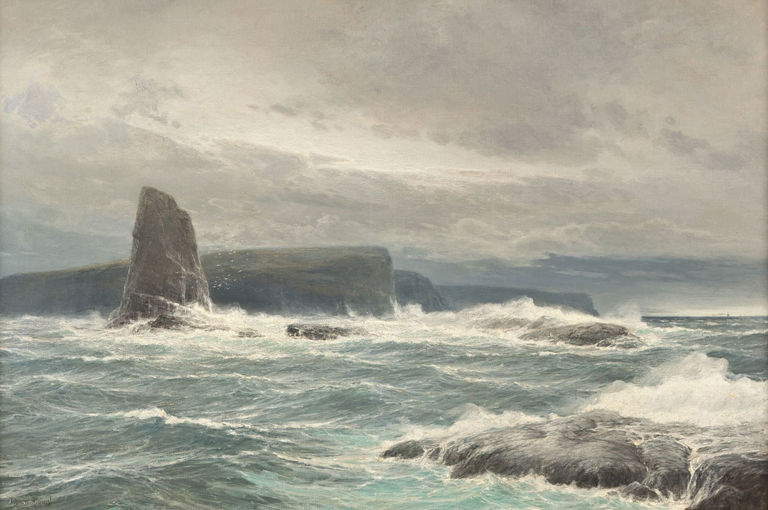 Kuva: Stormy sea in front of cliff landscape (Hugo Schnars-Alquist). Kuva esittää todennäköisesti Cliffs of Moher -kalliomuodostelmia Irlannin rannikolla. Wikimedia Commons.