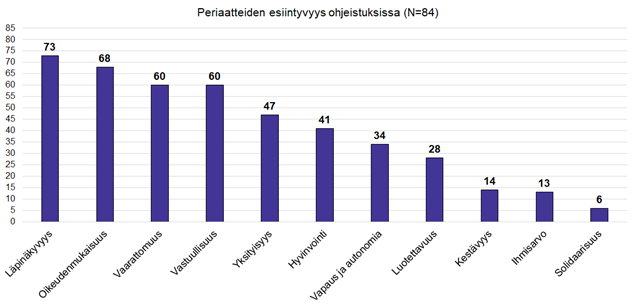 Alla oleva taulukko kuvaa, minkälaisia eettisiä periaatteita ohjeistuksissa on suositeltu tekoälysovellusten arvopohjaksi. Taulukko pohjautuu artikkeliin Jobin, A., Ienca, M., & Vayena, E. (2019). The global landscape of AI ethics guidelines. Nature Machine Intelligence, 1(9), 389–399.