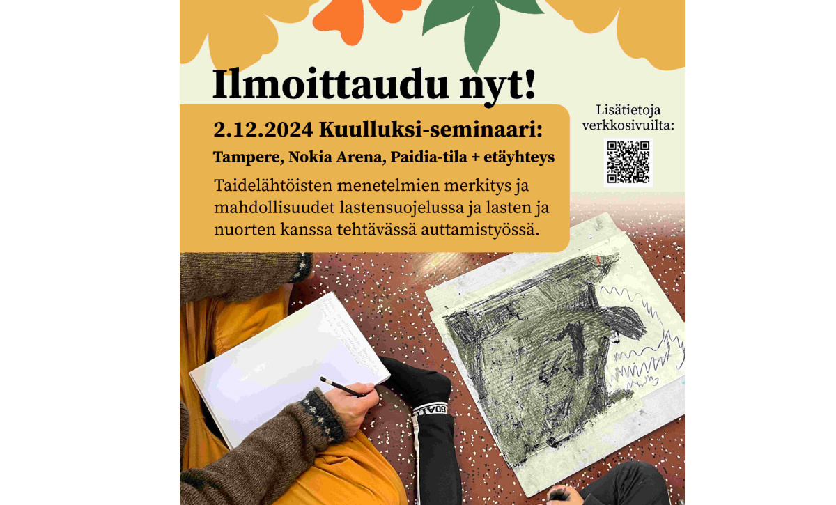 Seminaari on tarkoitettu kaikille, jotka ovat kiinnostuneita taidelähtöisistä menetelmistä auttamistyössä ja erityisesti lastensuojelun parissa. Osallistujamäärän maksimi paikan päällä 80 henkilöä (TÄYNNÄ), webinaariin ilmoittautuneille lähetetään linkki tapahtumaa edeltävällä viikolla.