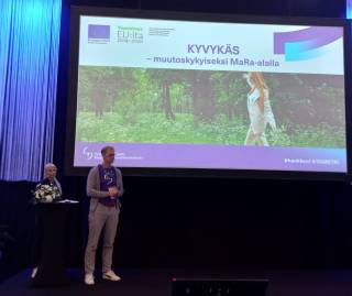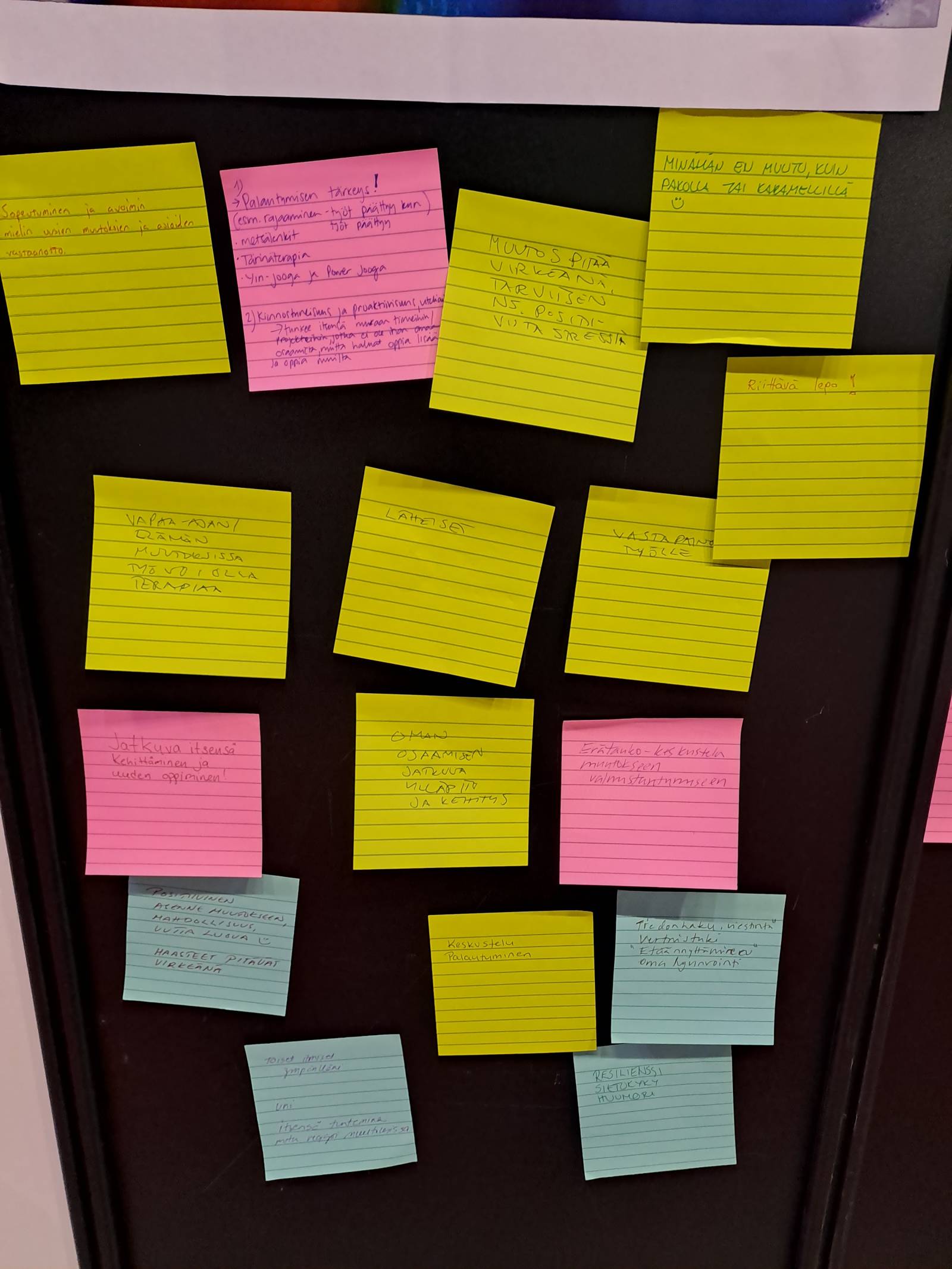 Kyvykäs -hankkeen kehittäjät kartoittivat messuvieraiden käsityksiä heidän omasta muutoskyvykkyydestään. Standilla käyneitä vieraita pyydettiin kirjoittaman post it-lapuille heille ensimmäisenä mieleen tulleita kykyjä ja keinoja, joilla he säilyvät toimintakykyisinä muutoksissa. Osallistujakokemuksissa korostui palauttava työn ulkopuolinen tekeminen ja palautuminen muun muassa erilaisten harrastusten parissa. Useampi mainitsi myös jatkuvan uuden oppimisen ja kehittymisen. Vastaanottavaista suhtautumista muutoksiin pidettiin myös tärkeänä. Toimivina keinoina mainittiin Työhyvinvointimessujen teeman mukaisesti myös vuorovaikutus ja keskustelut toisten kanssa. Oli antoisaa keskustella messuvieraiden kanssa hankkeestamme sekä hankkeemme tärkeistä teemoista. Uskallamme väittää, että näiden teemojen yhdessä ääneen ajatteleminen oli jo yhdenlainen työhyvinvointia edistävä pieni suuri teko.