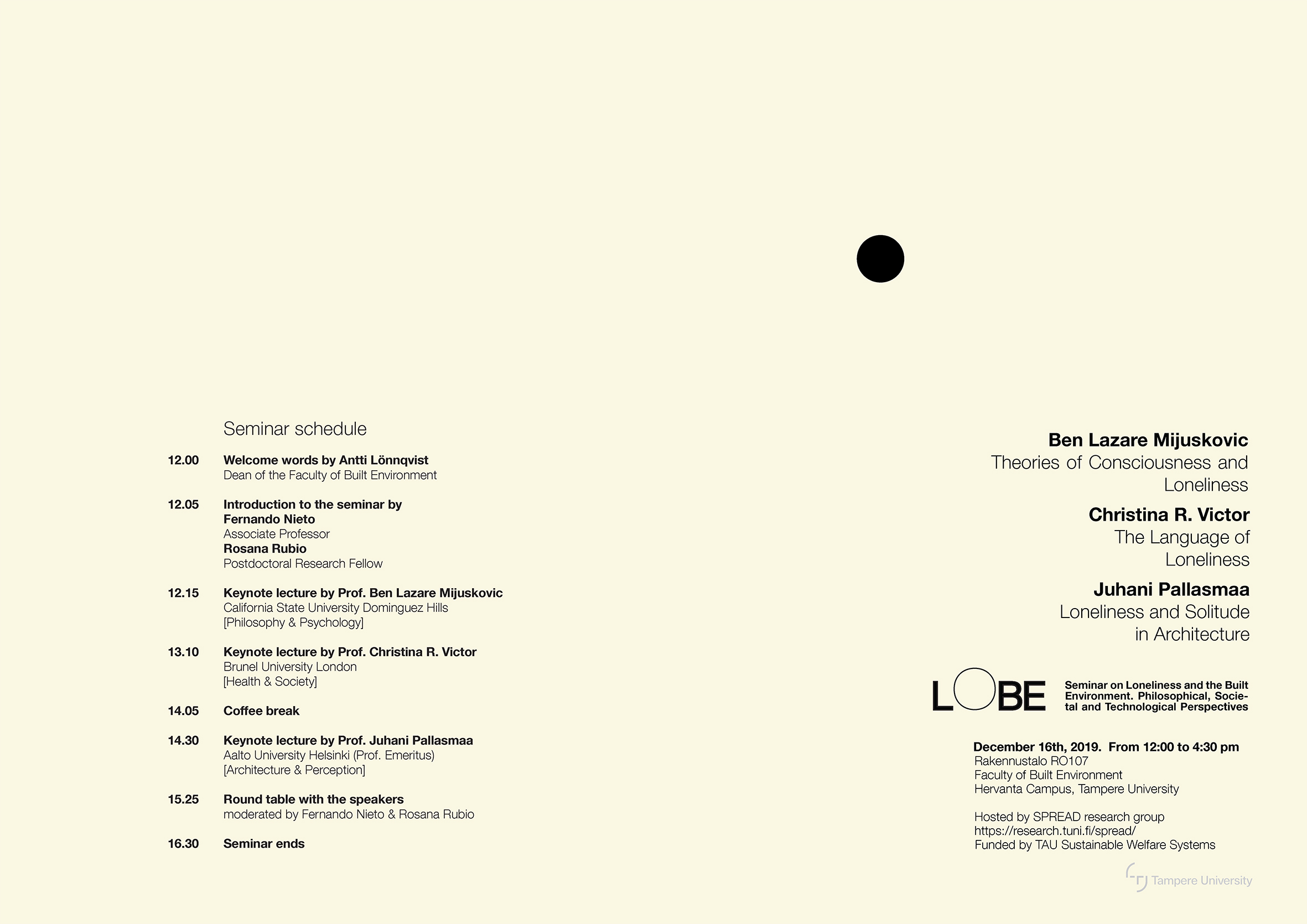 The one-day seminar we celebrated on December 16th, 2019 at TAU BEN, was to feed two ongoing multidisciplinary research projects led by SPREAD, which are framed in the context of loneliness. Both projects focus specifically on the inherent contradiction in Ambient Assisted Living technologies that, on the one hand, aim to solve a social requirement of independence, autonomy and active life when ageing and, on the other, pose the risk of an increase in the sense of loneliness in old people.
