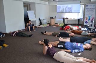 We started our journey in the world of improvisation on the first morning of the intensive week. The participants had just met each other, and you could definitely feel the excitement and even a hint of anxiousness in the air, as we started to walk across the room at different speeds to get oriented in the room and other participants. After we had discovered the delicate bodily sensations of slow-motion walking, it was time to lie on the floor and focus on our breathing and scanning through our bodies to calm down. Body scan exercise helped us to breath freely and to raise better mind-body awareness.