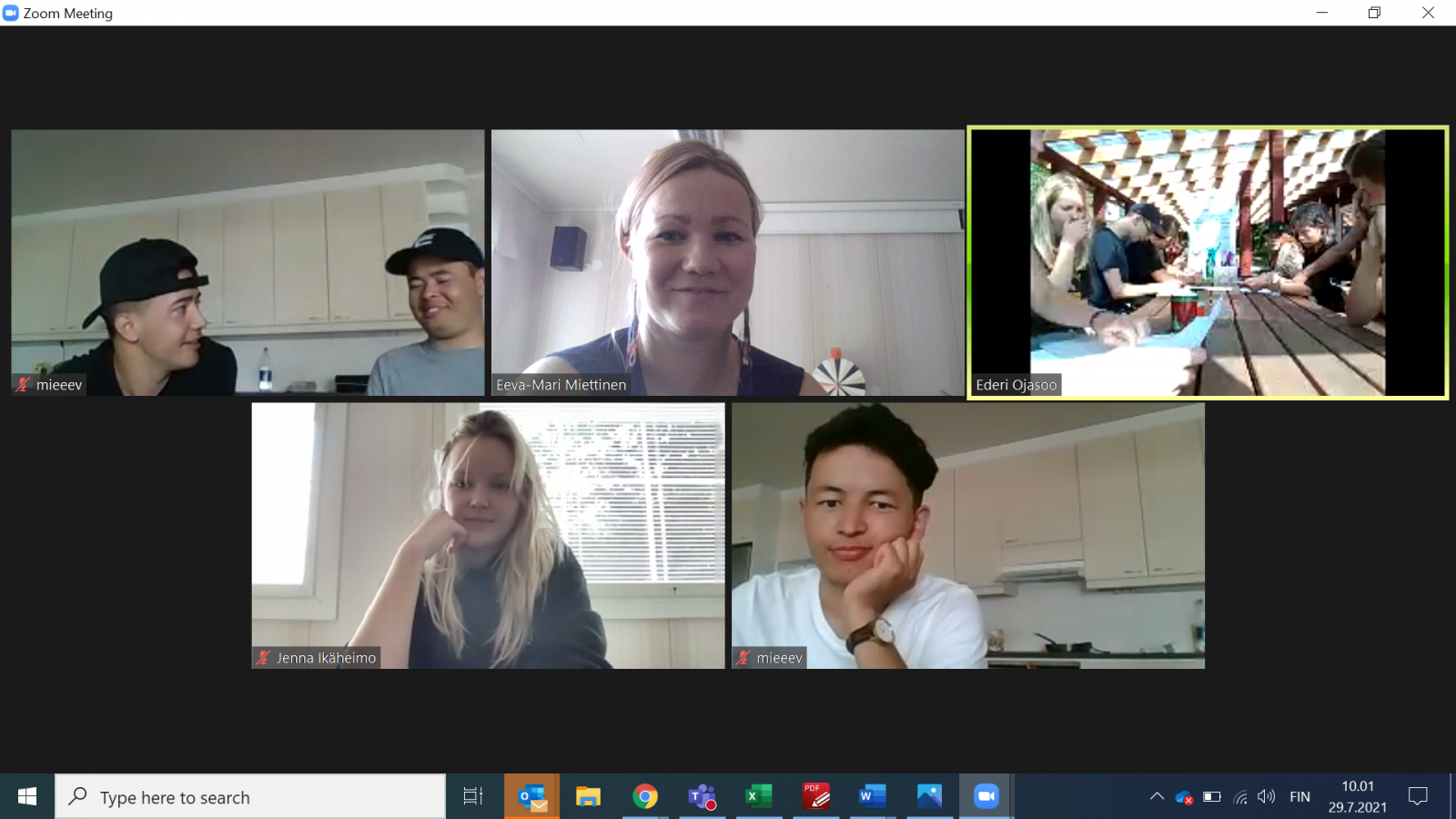 Group meetings of 25 people in zoom would need a lot of equipment (laptops etc.) in order to create equal possibilities for all participants. To offer a pleasant and easy-going, safe space for interaction and participation we decided to have the small group activities locally, meaning that the Finns were in one group, and the Estonians and Latvians in mixed international groups.