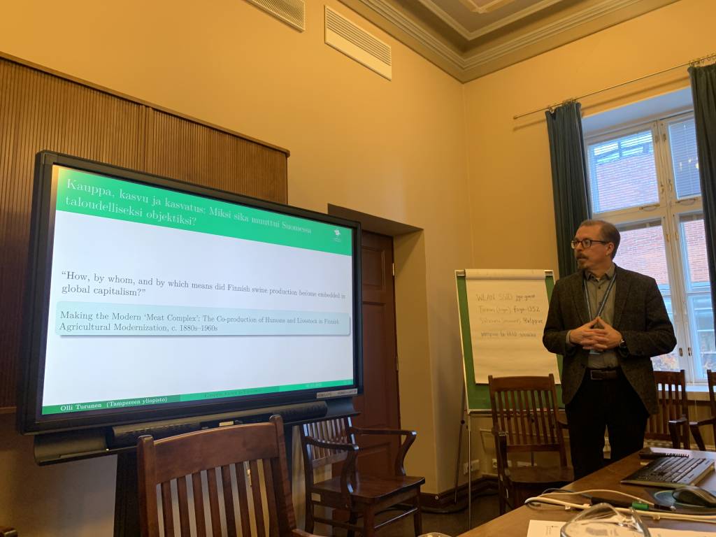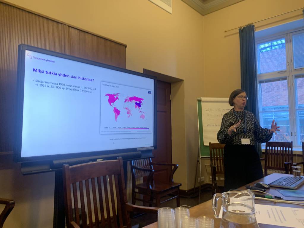 On Friday afternoon, the members of the team introduced the project in a joint session with presentations by Olli (The impact of macro-level trends and turning points on the Finnish swine husbandry), Hilja (The emergence of Finnish landrace swine in the context of livestock breeding trends in the early 20th century), and Marja (Landrace hog Pommi, 1917-1924, as an object and an actor in the midst of agromodernization).