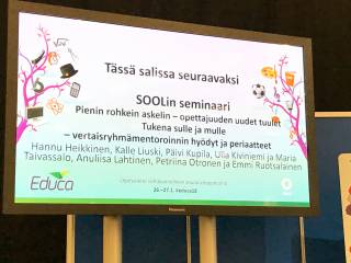 The two-day Educa trade fair started on Friday 26 January 2018, with a programme built around a theme entitled ‘The teacher teaches!’. Päivi Kupila, the Mentoring in ECEC Project Manager, participated in a seminar organised by the Teacher Student Union of Finland (SOOL), which discussed the benefits and principles of peer group mentoring. In addition to Päivi, the researchers’ perspective was also represented by Professor Hannu Heikkinen, who studies teachers’ peer group mentoring.