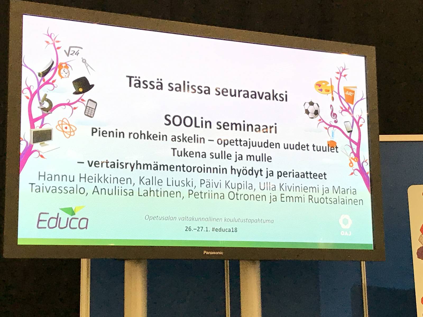 Perjantaina 26.1. alkoivat kaksipäiväiset Educa-messut, jonka ohjelma rakentui teeman Opettaja opettaa! ympärille. Mentorointia vakassa –hankkeen hankepäällikkö Päivi Kupila oli mukava SOOLin järjestämässä seminaarissa, jossa keskusteltiin vertaisryhmämentoroinnin hyödyistä ja periaatteista. Keskustelussa tutkijoiden näkökulmaa edusti Päivin lisäksi myös opettajien vertaisryhmämentorointia tutkiva professori Hannu Heikkinen.