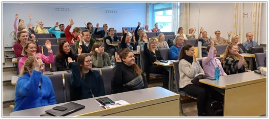 Kysyimme kuulijoilta, kuinka moni heistä olisi kiinnostunut ja valmis ottamaan hankkeessamme kehitettyjä toimia osaksi omaa opetustaan. Lähes kaikki nostivat kätensä pystyyn myönteisen vastauksen merkkinä.