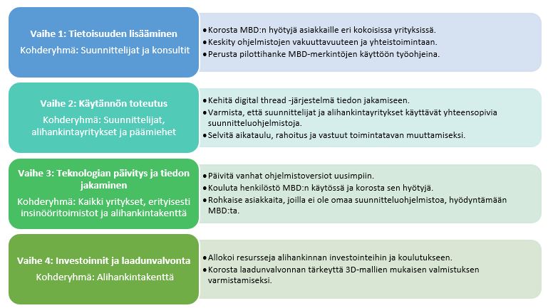 Ohjelmistojen vakuuttavuus ja erityisesti yhteistoiminta täytyy tuoda esiin. Toisaalta lisenssit ovat kalliita, jolloin ohjelmistoja on vaikea kokeilla. MBD:n kehitys on nopeaa ja yrityksissä on yleisesti käytössä vanhoja ohjelmistoversioita. Ensimmäinen askel olisi uusimpiin ohjelmistoversioihin päivitys. Tämän jälkeen tarvitaan muutama asiaan perehtyvä, jotka opettelevat asian ja levittävät tietoa hyödyistä. Tärkeä askel MBD:n käyttöönottoon on myös ns. digital thread, digitaalinen lanka, jota pitkin tieto siirtyy kaikille osapuolille.