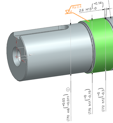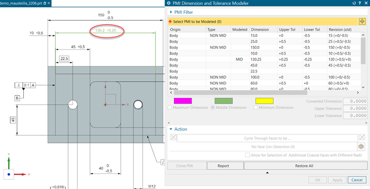 Kuvassa NX:ssä muutetaan nimellismittaa PMI-informaation perusteella työstöratojen ohjelmointia varten, kuten mallinnus osiossa mainittiin.