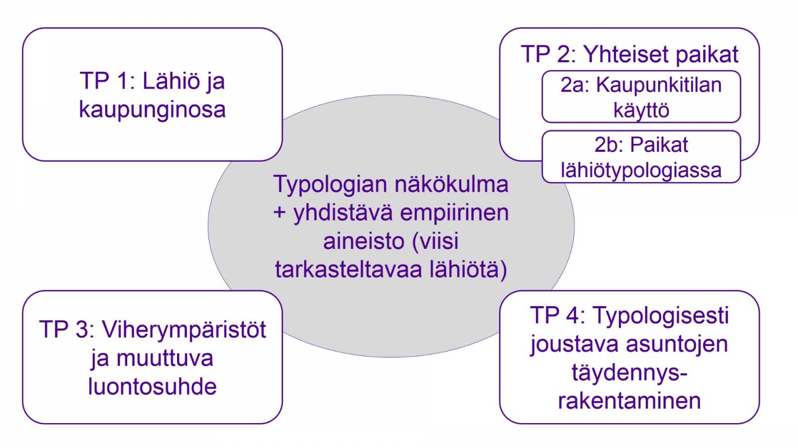 Työpaketissa 1 tarkastellaan lähiön määrittelyä suhteessa siihen, miten kaupunkia jaotellaan osiin ja määritellään tiivistämisen ja lisärakentamisen näkökulmasta. Lähiöillä oli omat keskuksensa, jotka nyt ovat korvautumassa uusilla kaupunginosien keskuspaikoilla. Tämä osuus liittää tutkimuksen myös ajalliseen, suomalaisen kaupunkirakenteen muotoutumista koskevaan tarkasteluun. Työpaketin lähtökohtana on kirjallisuuskatsaus, mutta työpaketti hyödyntää myös puolistrukturoitua haastatteluosuutta, jossa syvennetään ymmärrystä Espoon kaupunkisuunnittelun tavoitteista ja lähiöiden kehittämistyöstä.