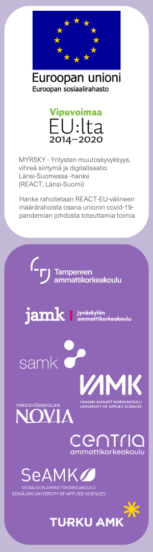 The goal of the MYRSKY project, ”Yritysten muutoskyvykkyys, vihreä siirtymä ja digitalisaatio Länsi-Suomessa (REACT ESR),” is to support businesses in the Western Finland region in recovering from the crisis caused by the Covid-19 pandemic. The project achieves this by offering businesses micro-courses and coaching sessions through collaboration with a network of universities of applied sciences. These initiatives aim to enhance the capabilities, skills, and adaptability of businesses and their personnel, fostering resilience in the face of change.