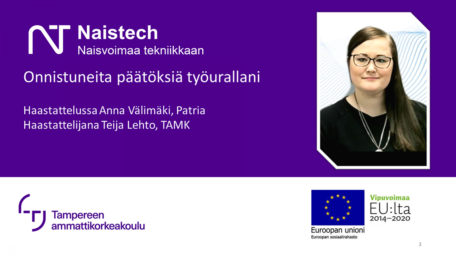 Anna Välimäki, Senior Sourcing Manager, työskentelee Patrialla. Hän kertoo videolla nousujohteisesta työurastaan teknisellä alalla sekä siitä, miten perhe-elämä ja työ saadaan sovitettua yhteen. Pieni kilpailuviettikään ei ole työelämässä pahasta, kun se suuntautuu oikein.