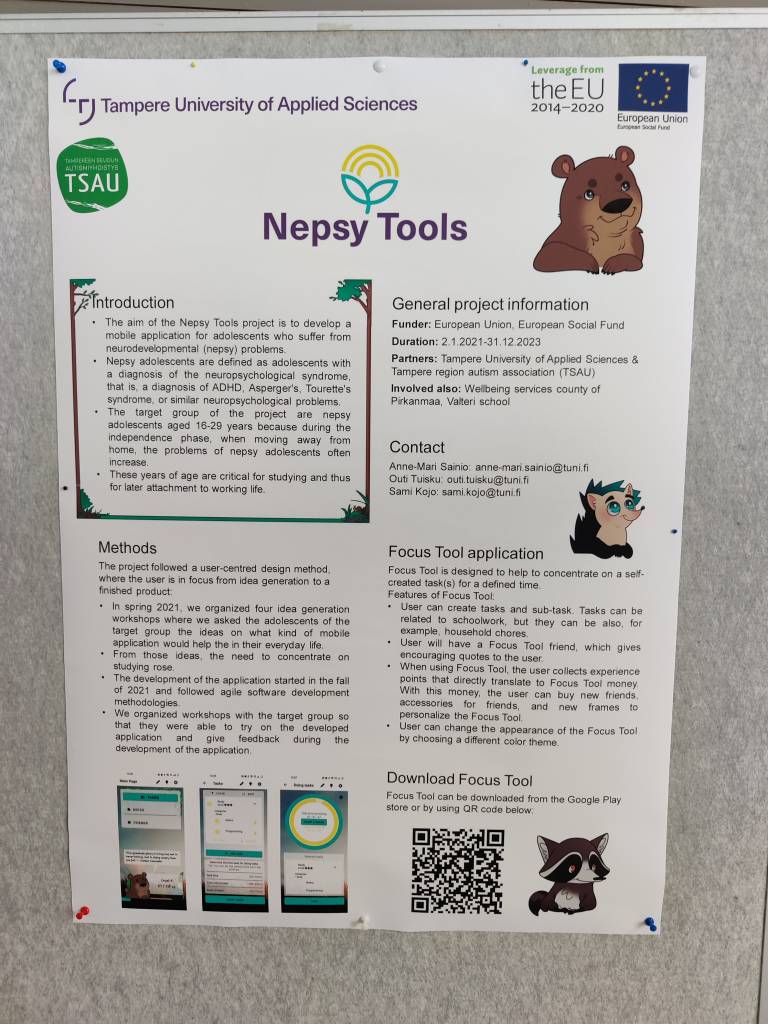 Nepsy Tools -hankkeessa ideoidaan, suunnitellaan ja toteutetaan mobiileja työkaluja erityisesti hyödyttämään nuoria, joilla on erilaisia haasteita arjen organisoinnissa ja vaikkapa opinnoissa pysymisessä. Nuoret ovat mukana ideoimassa, katselmoimassa ja testaamassa sovellusta. Kehittämämme sovellus on nimeltään Focus Tool ja se on ladattavissa sekä Google Play -kaupasta että Applen App Storesta ilmaiseksi.