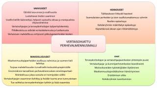 Kehitetyn perhevalmennusmallin vahvuuksia on tasa-arvoa ja osallisuutta edistävä toimintatapa sekä maahanmuuttaja-asiakkaiden näkökulmasta luotettavan tiedon saaminen. Tasa-arvoinen toimintatapa näkyy monin tavoin. Yhtäältä maahanmuuttajaperheille tarjotaan samankaltaista ryhmämuotoista perhevalmennusta kuin kantaväestöön kuuluvillekin ja toisaalta vertaisohjaajan myötä myös ohjaajuudessa näkyy tasa-arvoisuus terveydenhoitajan ja maahanmuuttajataustaisen vertaisohjaajan kesken. Toimintamallin keskeisenä tavoitteena on lisätä maahanmuuttajaperheiden osallisuutta ja se näkyy ryhmätoiminnan pitkäkestoisuudessa sekä virtuaaliperhevalmennuksessa myös sisällön tuottamisessa perhelähtöisesti. Lisäksi ryhmätoiminnan pitkäkestoisuus edistää vertaiskokemusta ja luottamuksen syntymistä.