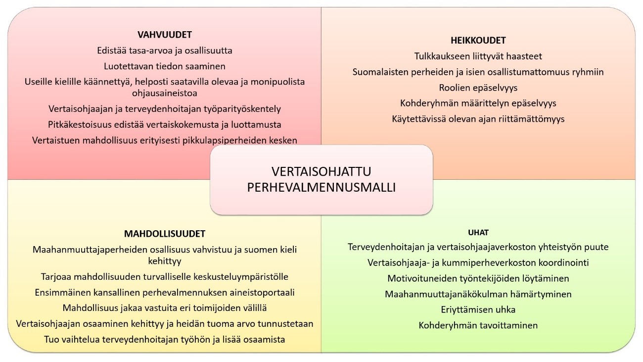 Hankkeessa tuotettu Perheinfo-aineistoportaali tarjoaa useille kielille käännettyä, helposti saatavilla olevaa ja monipuolista ohjausaineistoa, jota voi hyödyntää monin eri tavoin. Malliin sisäänkirjoitettu vertaisohjaajan ja terveydenhoitajan työparityöskentely on myös mallin kiistaton vahvuus. Sillä on voimaannuttava vaikutus niin terveydenhoitajan työhön kuin vertaisohjaajan elämäänkin ja monikulttuurisen ryhmän näkökulmasta se tuo monin tavoin toivoa pärjäämisestä uudessa maassa ja lisää vertaiskokemusta.