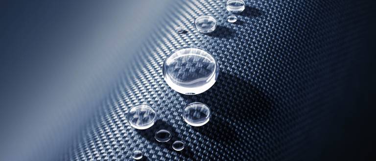 Kirkkaita vesipisaroita siniharmaalla pintamateriaalilla.