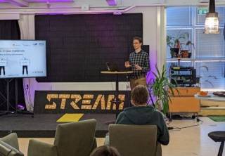 Huhtikuussa PITS vieraili myös Tribe Tampereen StartUp-talolla. Tribe Tampere on yhteisö ja alusta startup-yrittäjille. Tilaisuudessa hanketta esiteltiin englanninkielellä, sillä Triben oma toiminta tapahtuu paljolti englanniksi. Se toi oman jännityksensä tämänkertaiseen maakuntakierrokseen. Kuvassa hanke-esittelyä pitämässä PITS-hankkeen Atte Rättyä.