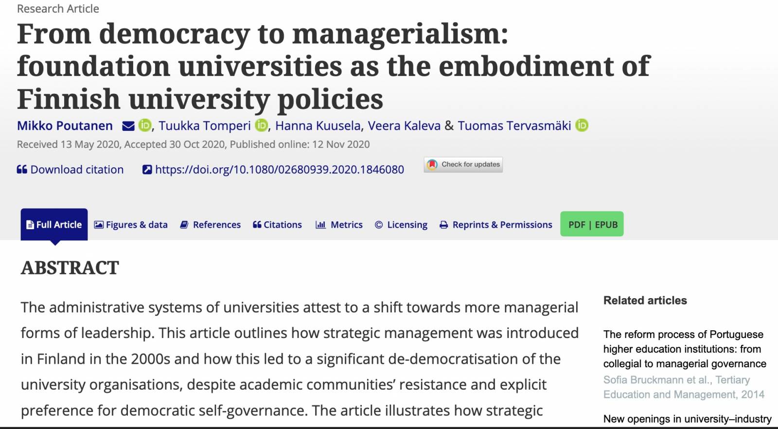 The article “From democracy to managerialism: foundation universities as the embodiment of Finnish university policies” has been written by Mikko Poutanen (POSTCAPE) together with Tuukka Tomperi, Hanna Kuusela, Veera Kaleva and Tuomas Tervamäki. It illustrates how the concept of “strategic management” has informed the reconceptualization of Finnish higher education in legislation (nationally) as well as in practice (locally) and has been used to drive through specific administrative reconfigurations. The authors refer to this as “anti-democratic transformation”, which is embodied in a new institutional model: foundation universities. The article can be accessed through this link.
