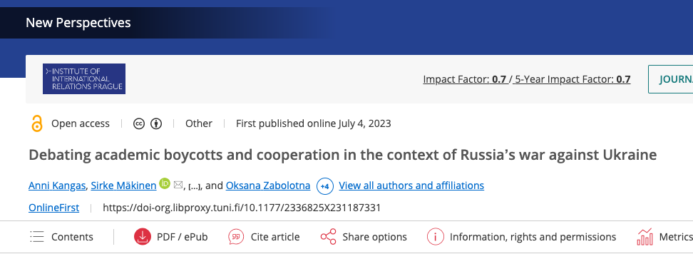 This forum, published in the New Perspectives journal, is a contribution to debates over the (im)possibility of cooperating with the Russian academic community while Russia’s war against Ukraine continues. After briefly reviewing previous studies on the effectiveness and morality of academic sanctions, the forum continues to assess the politics and effectiveness of the academic boycott in changing the belligerent behaviour of the Russian regime. For this purpose, it introduces the idea of ontological (in)security and moves on to discuss, from different perspectives, whether sanctions and boycotts may lead to policy change by way of destabilizing the ontological security of Russia, or whether the academic boycott contributes to strengthening the ruling authoritarian regime. The forum has been co-authored by Anni Kangas together with Sirke Mäkinen, Dmitri Dubrovskiy, Judith Pallot, Svetlana Shenderova, Gelb Yarovoy and Oksana Zabolotna.