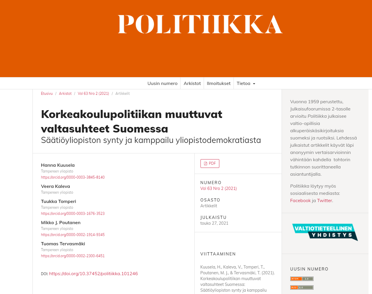 Kuusela, H., Kaleva, V., Tomperi, T., Poutanen, M. J., & Tervasmäki, T. (2021). Korkeakoulupolitiikan muuttuvat valtasuhteet Suomessa: Säätiöyliopiston synty ja kamppailu yliopistodemokratiasta. Politiikka, 63(2): 158-187. https://doi.org/10.37452/politiikka.101246
