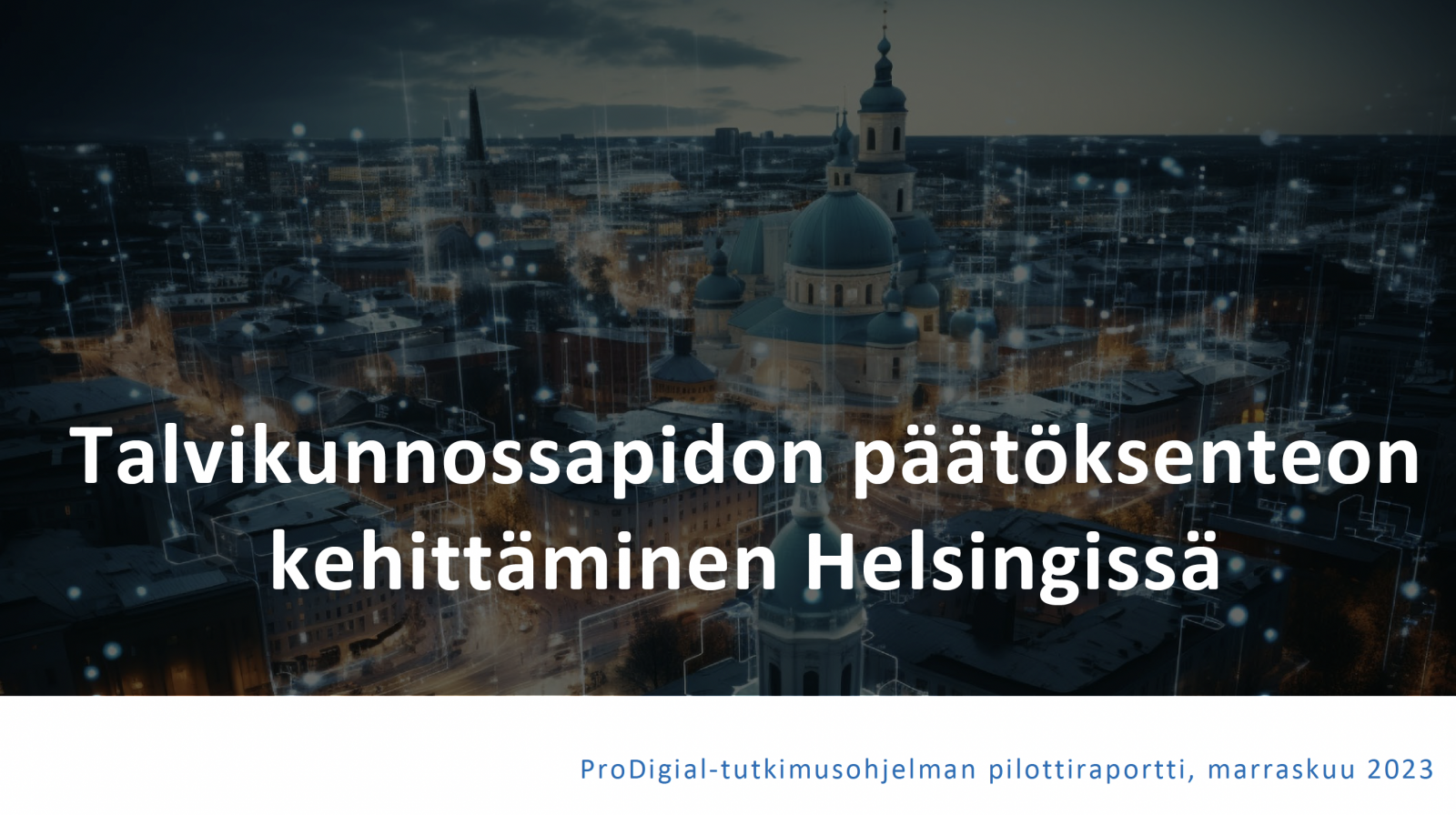 Talvikunnossapito on vaikuttava palvelu, jonka tehokkaalla hoitamisella saavutetaan parempaa liikkumisen sujuvuutta, turvallisuutta ja taloudellisuutta. Helsingin pilotin tavoitteena oli saada ymmärrys lumenkäsittelyn arvokokonaisuudesta päätöksenteon prosesseissa. Työn tuloksena syntyi talvikunnossapidon päätöksentekoa ja kehittämistä ohjaava arvokehikko.