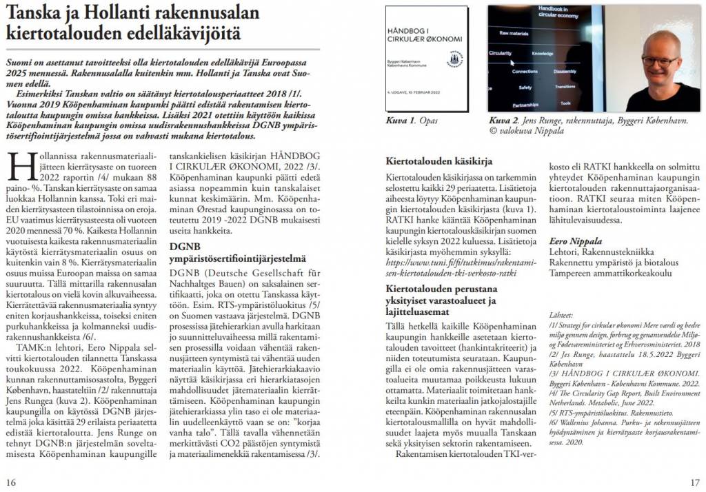 Eero Nippala kertoi Tampereen Rakennusmestari -lehdessä 04/22 tuoreita kiertotalouskuulumisia Tanskasta ja Hollannista. Molemmat maat ovat rakentamisen kiertotaloudessa Suomea edellä - rakennusmateriaalien kierrätysaste on lähes 90 paino-% eli selvästi yli EUn vaatimustason 70 %. Suomessa rakennus- ja purkualan kierrätysaste oli vuonna 2020 noin 60 % (Wallenius 2020).