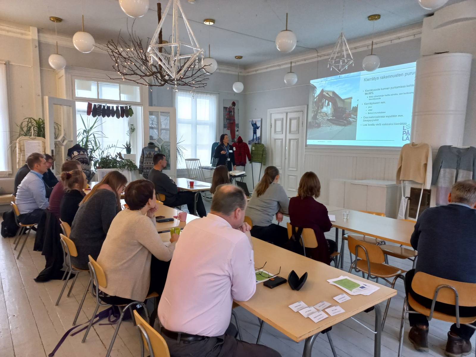 Werstaan aluksi Lempäälän kunnan rakennuttajapäällikkö Ulla Palo-Oja kertoi, miten monella eri tavalla kiertotalous ilmenee kunnan toiminnassa. Osin kiertotalous on jo uponnut osaksi normaalia toimintaa ja osin vasta tulossa. Lempäälän kunnassakin on pohdittu ja toteutettu useita kiertotalouteen liittyviä pieniä ja isompia toimia, kuten esimerkiksi kalusteiden uudelleenkäyttöä, jossa on käytetty apuna Kiertonet.fi -palvelua. Vanhan S-marketin rakennuksen betonielementit myytiin uudelleenkäyttöön Valkeakoskelle. Tilojen muuntojoustavuus otetaan huomioon kaikissa uudisrakennushankkeissa. Mitään käytöstä poistettua ei heitetä hukkaan. Kiertotalous on myös jakamista – uutena ideana onkin mietitty kalusteiden vuokrausta koulujen juhliin, joissa on kaksi kertaa vuodessa tarve isolle määrälle tuoleja.
