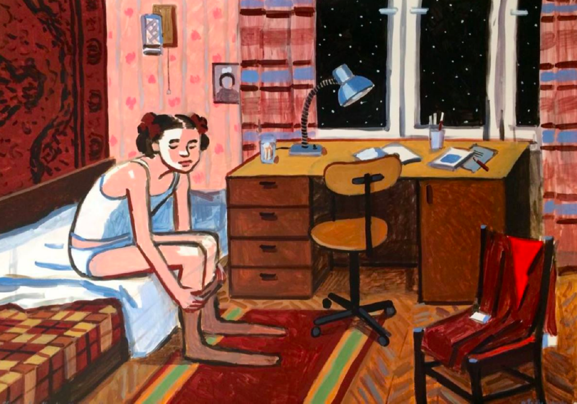 A girl pulling on her nylons before getting ready for school by Cherkassky-Nnadi from Lenin On Linen: An Artist Remembers Her Soviet Childhood