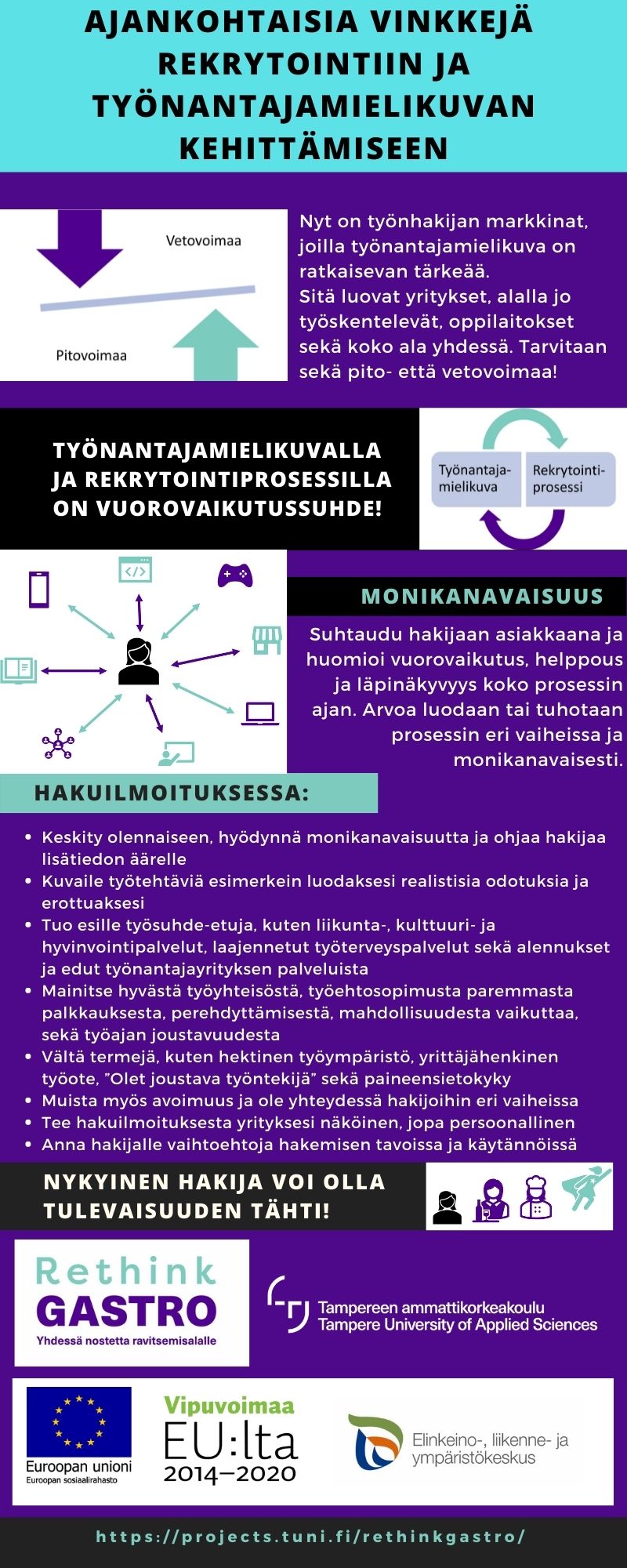 Kevään 2022 aikana kolme restonomiopiskelijatiimiä perehtyi rekrytointiin ja työnantajamielikuvaan Rethink Gastro -kumppaniyritysten kanssa. Opiskelijat analysoivat työnhakuilmoituksia, tunnistivat osaavan työvoiman saatavuushaasteita ja miettivät ratkaisuja rekrytoinnin kehittämiseen. Opiskelijaprojektien tuloksista on laadittu hankeasiantuntijoiden toimesta oheinen infograafi: Linkki pdf-tiedostoon: Rekrytoinnin kehittäminen, infograafi.