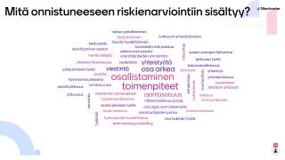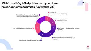 Seminaariosallistujat pääsivät Mentimeterin avulla valitsemaan kolme mielestään käyttökelpoisinta tapaa tukea riskienarviointiosaamista. Osallistujat nostivat riskienarvioinnin eri vaiheista, merkityksestä ja arvioinnissa esiin nousseista asioista viestimisen käyttökelpoisimpien joukkoon. Onnistuneeseen riskienarviointiin sisältyvät tekijät jakoivat osallistujien mielipiteitä enemmän. Mentimeterin kuvaaja ja sanapilvi alla.