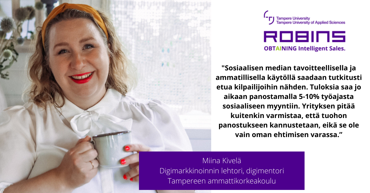 Miina kertoo sosiaalisesta myynnistä ja digitaalisesta markkinoinnista sekä ROBINS-tutkimushankkeen kokoomateokseen kirjoittamastaan artikkelista ja näin: