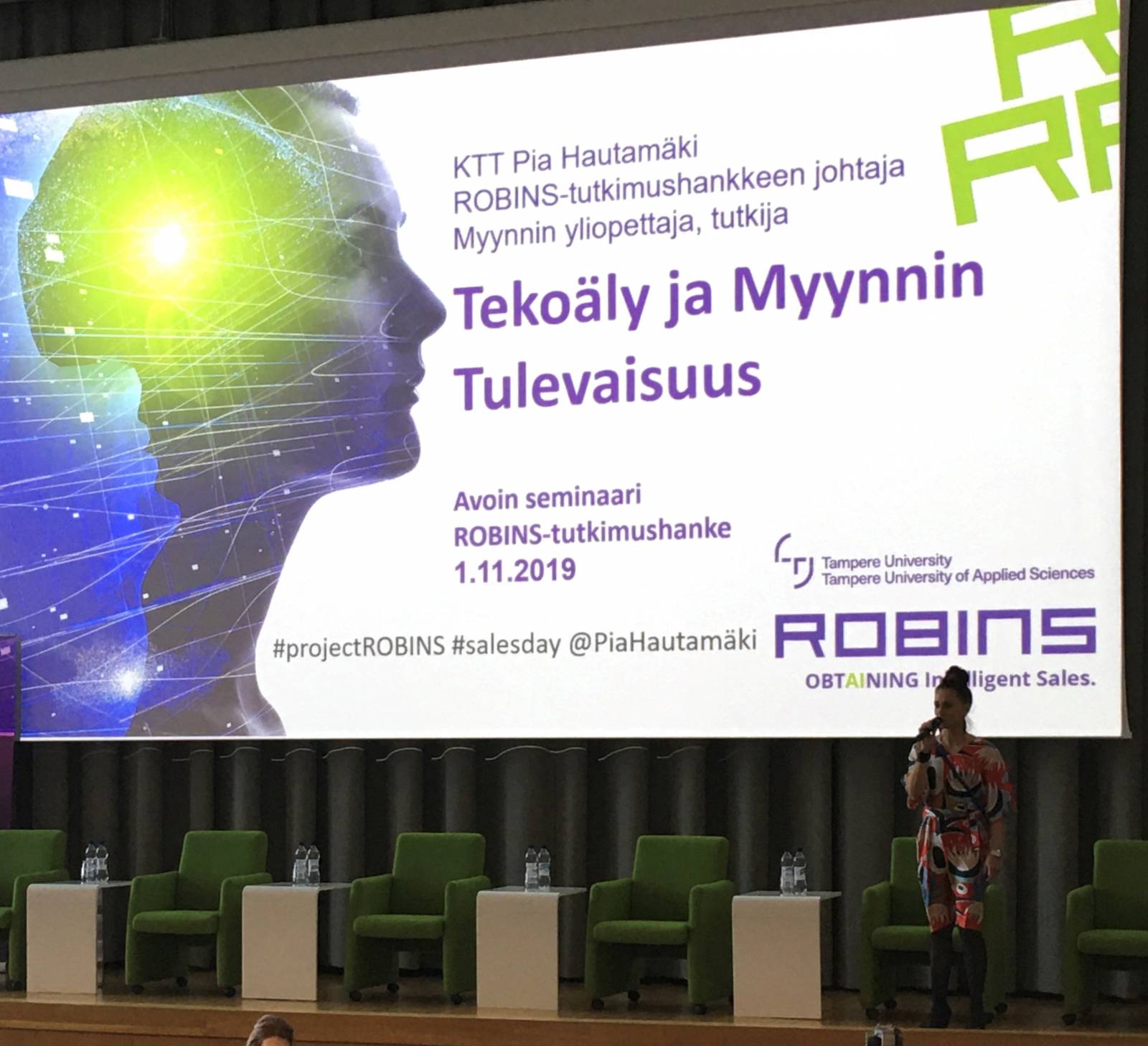 SalesDay-seminaarin keynote puhujana toimi filosofi, tietokirjailija, VTT Maija-Riitta Ollilla, joka kertoi tekoälystä ja työn tekemisen transformaatiosta. Paneelissa Robins-tutkijat ja yhteistyöyritykset keskustelivat siitä, miten tekoälyä ja uusia teknologioita voi hyödyntää myynnissä ja myynnin johtamisessa. Tutkijat Minna Heikinheimo ja Sami Rusthollharhu valottivat sitä, mitä aiheesta tiedetään tällä hetkellä ja mitä pitää vielä selvittää.