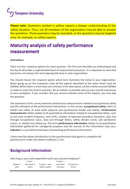 More on Jääskeläinen, A, Tappura, S., Pirhonen, J. (2019). Maturity analysis of safety performance measurement. In: Ahram, T. et al. (eds.), Proceedings of the 2nd International Conference on Human Systems Engineering and Design II (IHSED2019): Future Trends and Applications. Advances in Intelligent Systems and Computing, vol 1026. Springer, Cham, pp. 529-535.