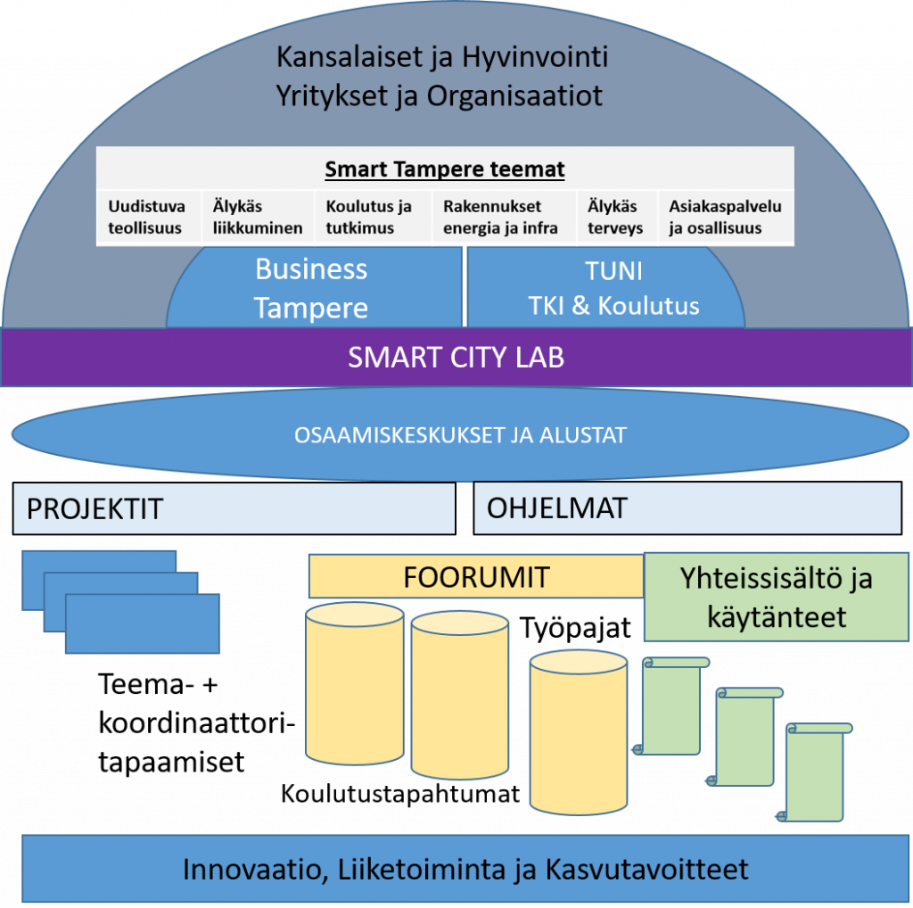 Tampere Smart City -strategian teemoja ovat 1) asiakaspalvelu ja osallisuus, 2) koulutus ja tutkimus, 3) rakentaminen, energia ja infra, 4) tekoäly ja analytiikka, 5) terveys ja hyvinvointi, 6) turvallisuus, 7) uudistuva teollisuus, 8) yhteydet ja 9) älykäs liikkuminen. Myös Tampereen korkeakouluyhteisön tutkimuksessa, koulutuksessa ja palveluissa nämä kaikki ovat tärkeitä teemoja, joita jo viedään eteenpäin monissa eri yksiköissä ja projekteissa sekä useiden yhteistyökumppanien kanssa. Aikaisemmin korkeakoulujen älykkääseen kaupunkikehittämiseen liittyviä erilaisia aktiviteetteja ja verkostoja ei ole koottu yhteen eikä niiden välistä synergiaa ole kehitetty. Tampereen korkeakouluyhteisön Smart City Lab -hanke tähtää tähän, ja samalla myös älykkääseen kaupunkiin liittyvien tutkimushankkeiden, koulutuksen ja muiden aktiviteettien aikaisempaa tavoitteellisempaan kehittämiseen, jossa päästään hyödyntämään joustavasti korkeakoulujen monipuolista osaamista, verkostoja ja resursseja.