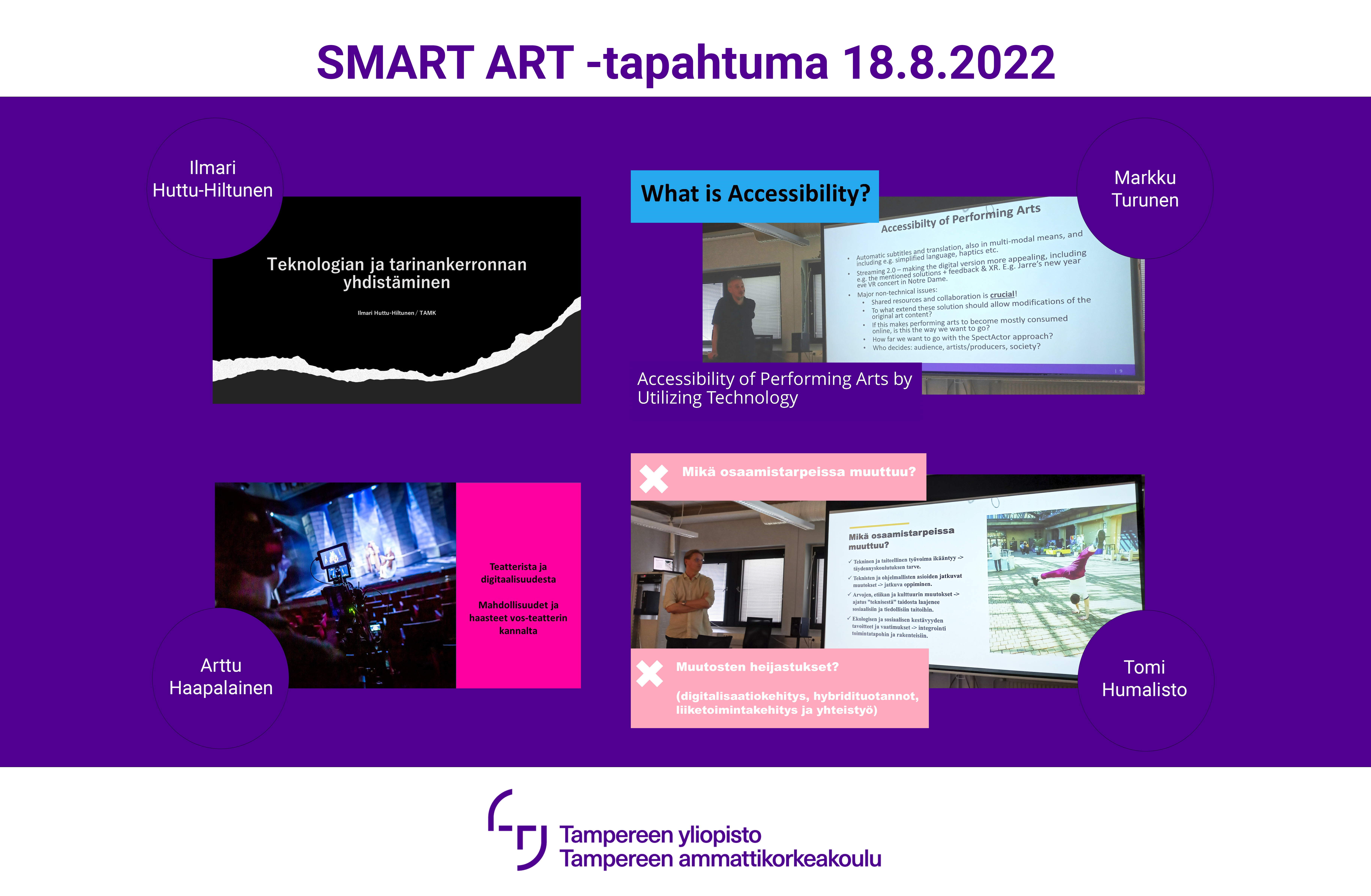 Baltzar kävi läpi Pirkanmaalla toteuttamiensa haastattelujen tuloksia ja johtopäätöksiä esittävän taiteen nykytilan, osaamistarpeiden ja koulutuksen suunnittelun kannalta. Kylänen puolestaan toi näkökulmia kansallisesta ja kansainvälisestä vertailututkimuksesta eli benchmarking-työstä siitä, miten esittävissä taiteissa digitaalisia ratkaisuja on sovellettu ja millaista yhteistyötä erilaisten toimijoiden välillä tehty.