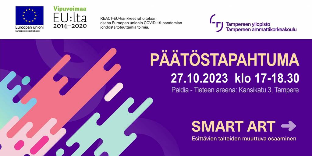 Tervetuloa pureutumaan näihin kysymyksiin kolmetuntisessa workshopissa, jonka vetäjinä toimivat SMART ART – Esittävien taiteiden muuttuva osaaminen -hankkeen asiantuntija Mika Kylänen ja projektipäällikkö Maaret Salminen Tampereen ammattikorkeakoulun Liiketoiminta ja media -osaamisyksiköstä.