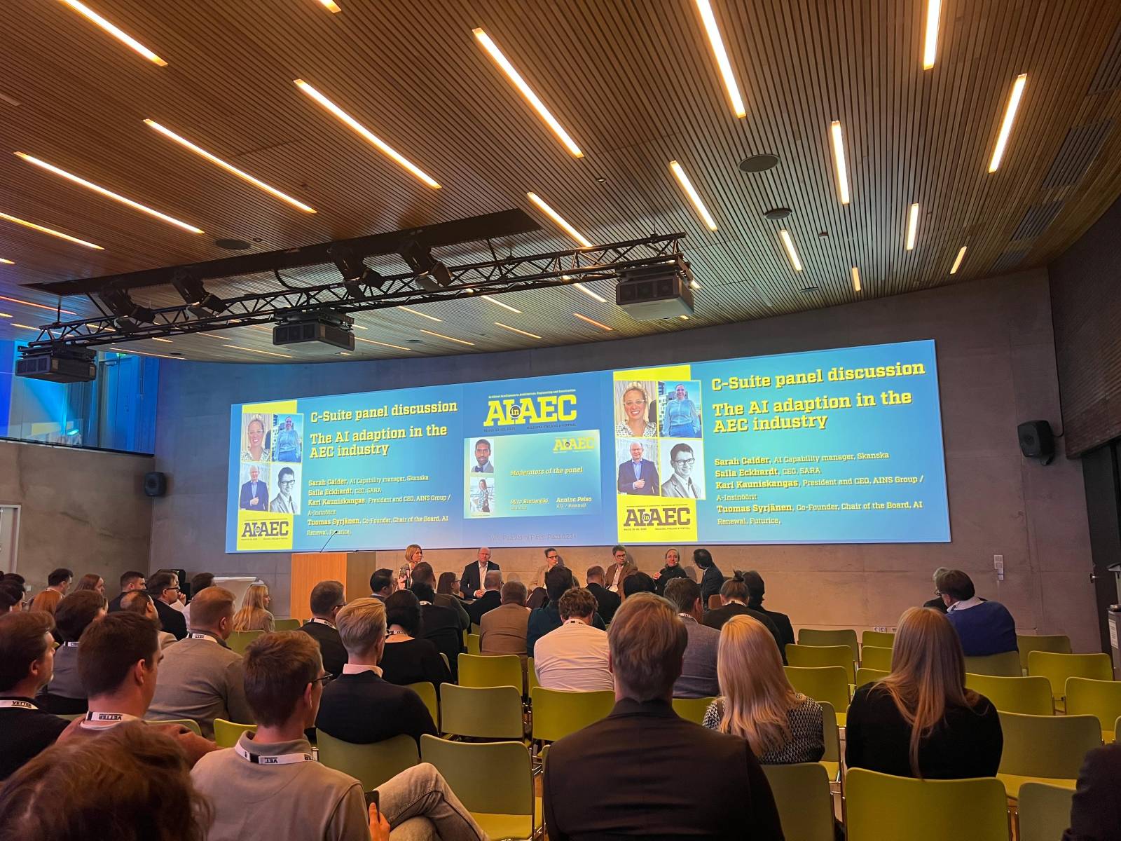 Konferenssissa nähtiin esityksiä tekoälyn soveltamisesta rakennusalalla koko arvoketjun laajuudessa. Yksi esitysten keskeisistä viesteistä oli, että tekoälyn soveltamisen tarkoituksena ei ole ensisijaisesti korvata ihmistä prosessissa, vaikka se väistämättä muuttaakin työn luonnetta. Sen sijaan tekoäly nähdään työkaluna, joka esimerkiksi auttaa suunnittelijaa tutkimaan ja analysoimaan vaihtoehtoja aiempaa tehokkaammin ja monipuolisemmin. Tämä ihmisen ja koneen yhteistyö on juuri se suunta, johon pyrimme myös hankkeessamme: ymmärrämme ensin teknologian mahdollisuudet ja rajoitteet, joihin pohjautuen pyrimme yhdessä eri alojen asiantuntijoiden kanssa tunnistamaan parhaat mahdolliset tavat soveltaa tekoälyä suunnittelijoiden tukena.