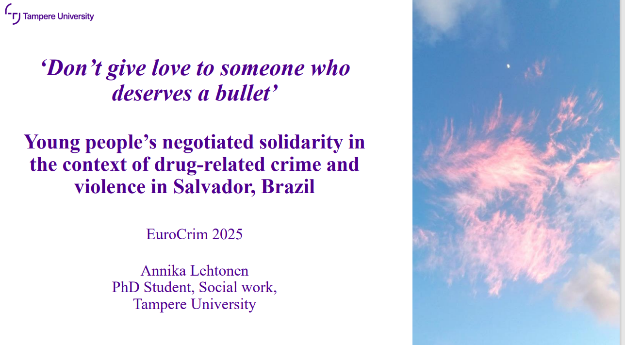 Annika Lehtonen piti konferenssissa puheenvuoron 4.9.2025: Don’t give love to someone who deserves a bullet’ – Young people’s negotiated solidarity in the context of drug-related crime and violence in Salvador, Brazil.