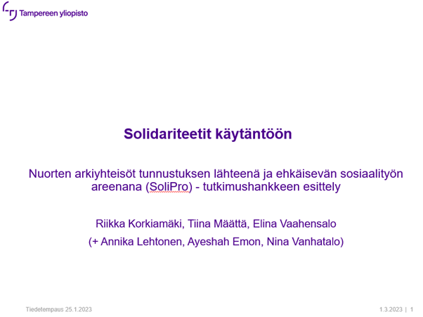 Porin yliopistokeskuksessa järjestettiin 25.1.2023 Tiedetempaus, joka kokoaa yhteen talon tieteentekijöitä eri aloilta. SoliPro-hankkeen johtaja Riikka Korkiamäki ja tutkija Elina Vaahensalo esittelivät tilaisuudessa Solipro-tutkimushankkeen taustaa, tavoitteita sekä aineistontuotantoa.
