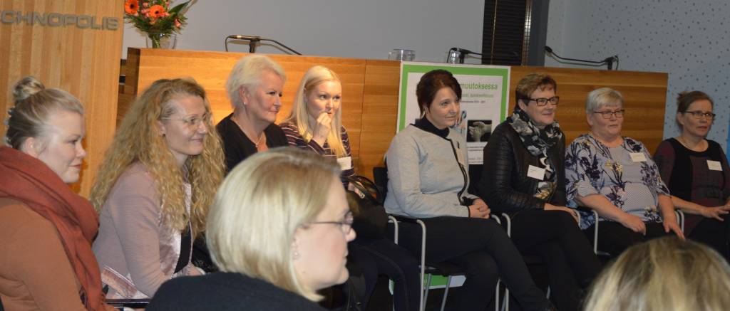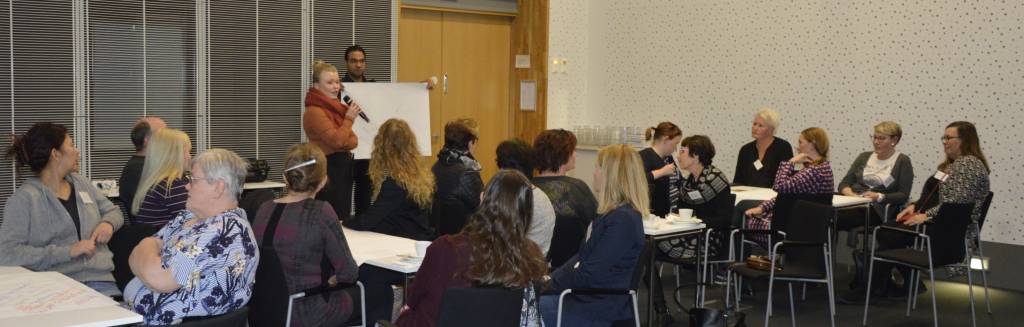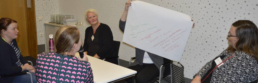 Viimeinen osuus tilaisuudessa oli hankkeeseen osallistuvien työpaikkojen henkilöstön kohtaaminen ja kokemusten vaihto. Ryhmissä pohdittiin Miten tulla ammattilaisena ja osaajana nähdyksi sekä kuulluksi. Tämän kohtaamisen virittäjänä toimi Jenni Kulmalan (Seinäjoen ammattikorkeakoulu) alustus Millaisena vanhustyön ja lastensuojelun kenttä nähdään?.