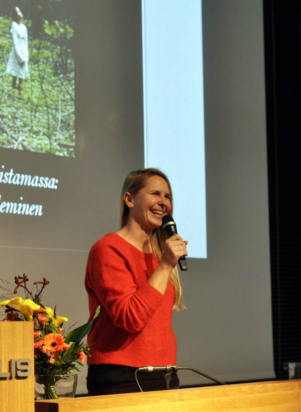 Tutkijatohtori Maija Mänttäri-van der Kuip pohti puheenvuorossaan, kuinka jatkuva pärjääminen on kestämätön vaihtoehto, eikä työssä uupumista pidä hyväksyä normaaliksi osaksi urapolkua.