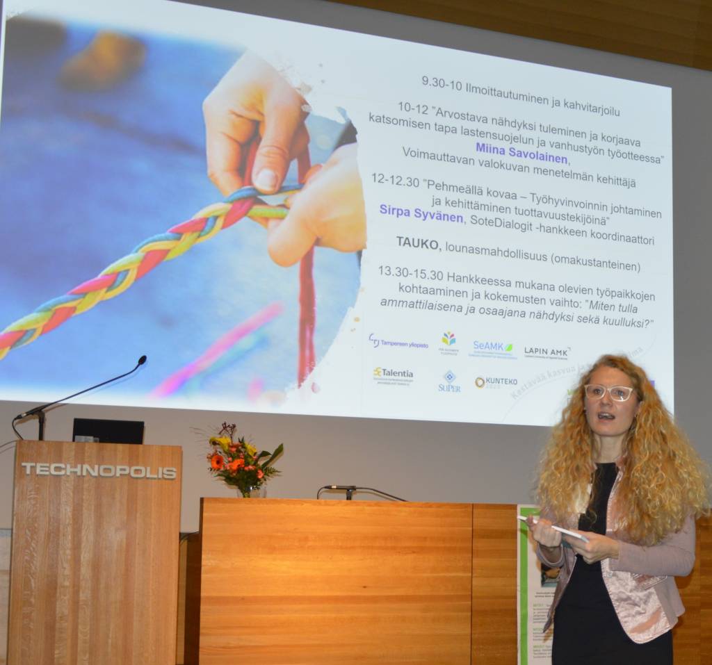 Toisen puheenvuoron piti Sirpa Syvänen, Tampereen yliopisto. Aiheena oli Pehmeällä kovaa – työhyvinvoinnin johtaminen ja kehittäminen tuottavuustekijöinä. Keskeisia sekä työhyvinvoinnin että tuloksellisuuden parantamisen keinoja ovat eri ihmisten välinen dialogi ja vuorovaikutus, vaikutus- ja osallistumismahdollisuudet, tuki ja apu sekä innostus ja kannustus. Niitä ei kuitenkaan riittävästi työn ja johtamisen arjessa sovelleta. SoteDialogit hankkeessa niitä opetellaan ja opitaan ja saadaan myös syvällisempää ymmärrystä siitä, mihin niiden vaikutus ja teho perustuvat.