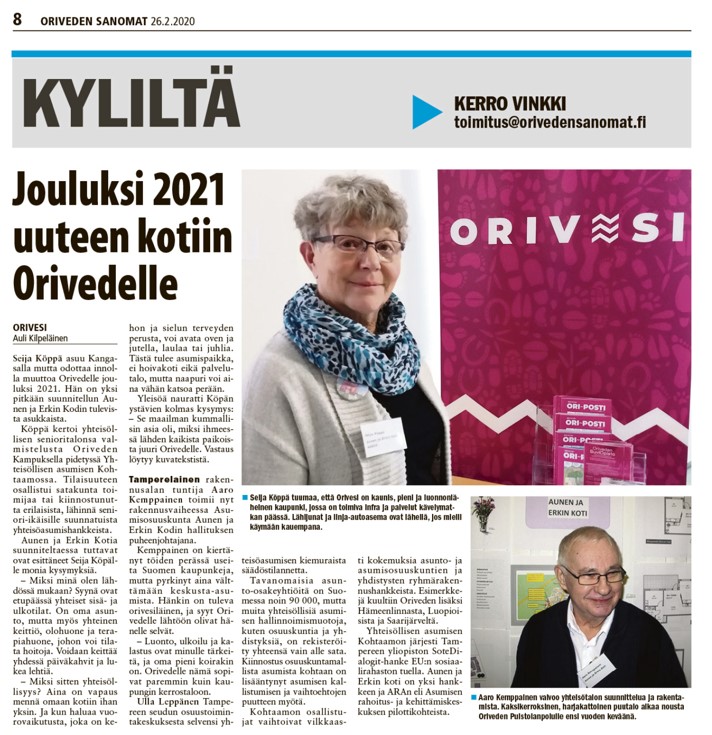 - Oriveden Aunen ja Erkin Koti – yhteisöllinen senioritalo rakenteilla, hankejohtaja Ilkka Kaakkolammi ja asukasyhteisön edustaja Seija Köppä
