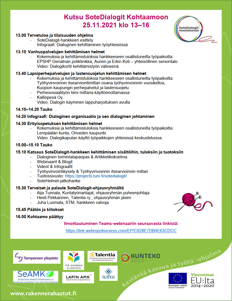 Marraskuun 25. päivänä toteutettiin SoteDialogit-hankkeen Kohtaamo, jossa esiteltiin hankkeeseen osallistuneiden työpaikkojen kokemuksia ja päästiin kurkistamaan hankkeen tuotoksiin. Webinaarissa esitellyt infograafit löytyvät SoteDialogit hankkeen INFOGRAAFIT linkin takaa ja webinaarista tehdyn sisältökoosteen pääsee halutessaan katsomaan täältä