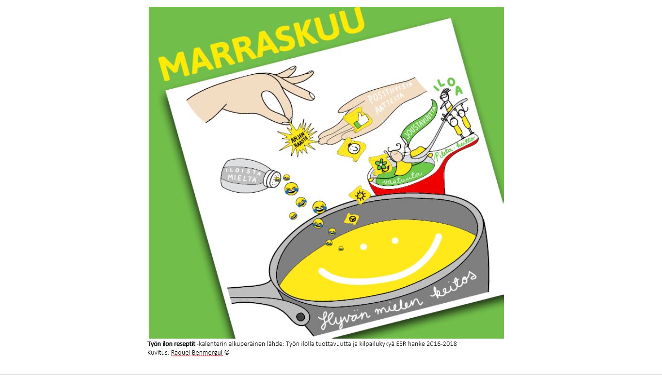Hyvän mielen -keitoksen raaka-aineina ovat positiiviset aatteet, yhteishenki, arjen haasteet ja iloinen mieli.
