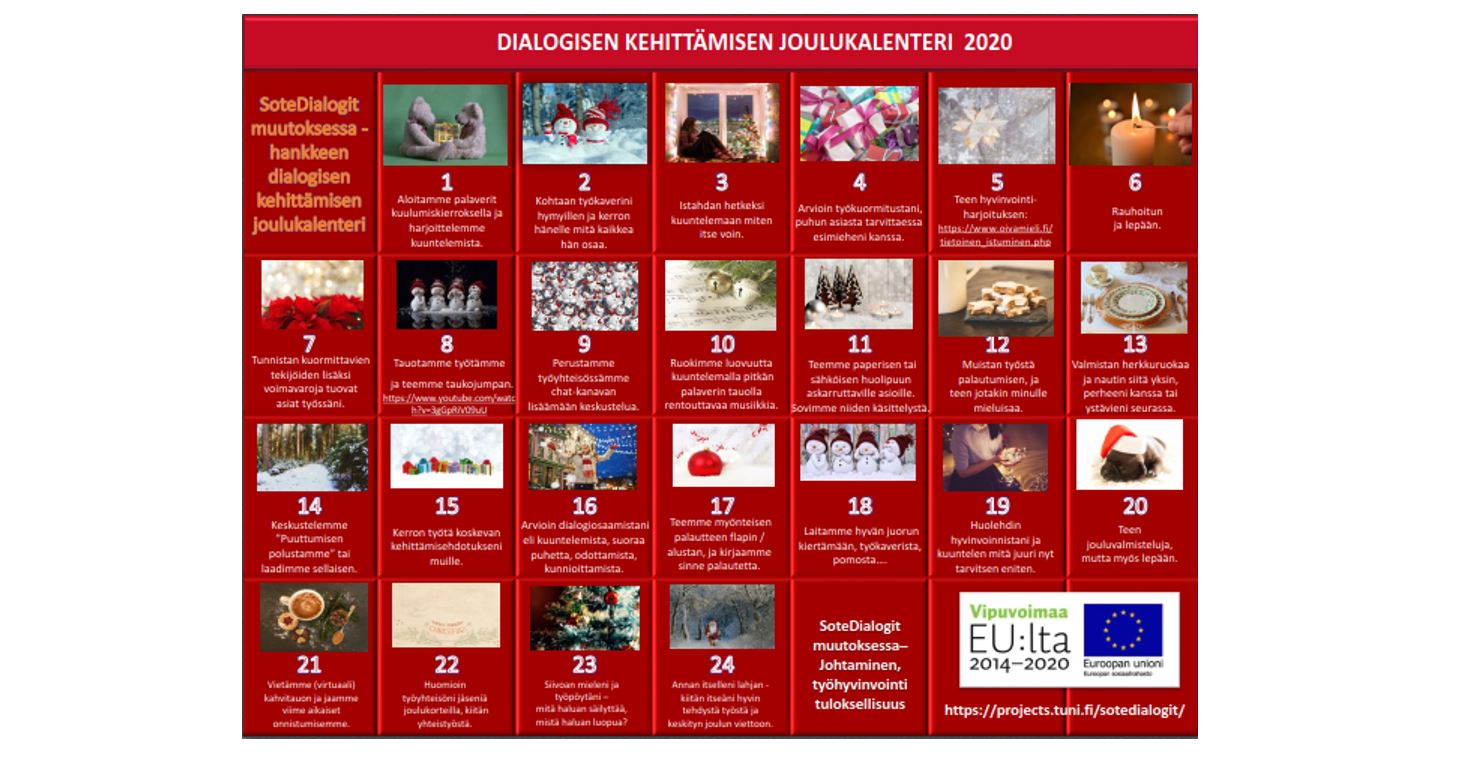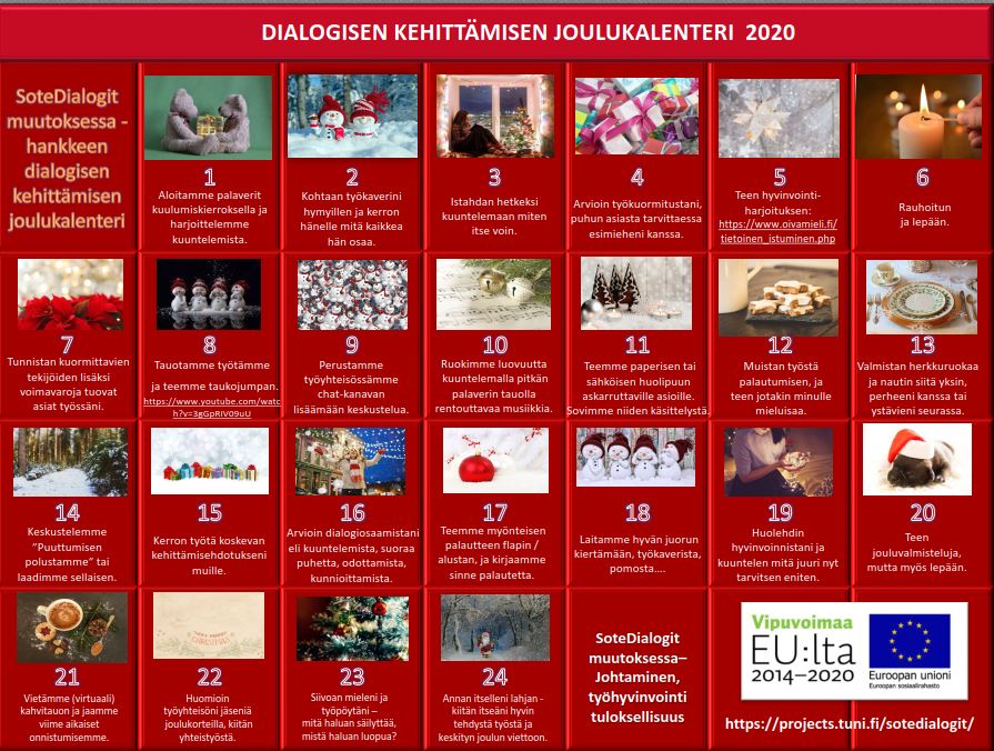 SoteDialogit-hankkeen Dialogisen kehittämisen Joulukalenteri 2021 1.12.2023 SoteDialogistien joulukalenterissa on luukku joka päivälle aina jouluaattoon asti. Kussakin luukussa on dialogiseen kehittämiseen liittyvä sisältö. Hyvää Joulun odotusta kalenterin myötä. Dialogisen kehittämisen Joulukalenteri 2021 (pdf)