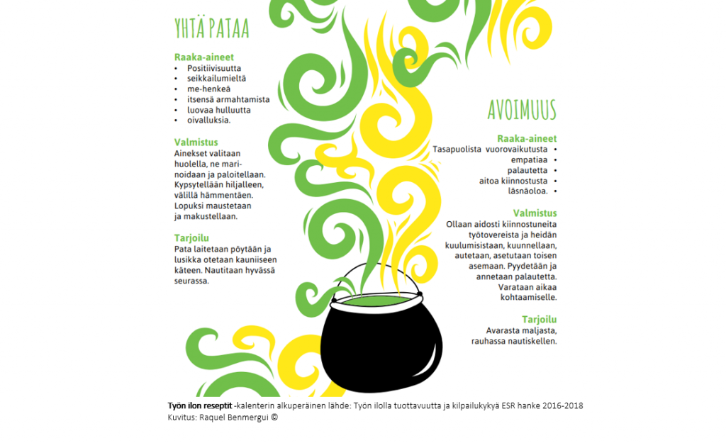 Yhtä pataa -reseptillä voidaan edistää yhteisöllisyyttä ja innovatiivisuutta. Seikkailumieli, luova hulluus ja oivallukset muistuttavat kokeilukulttuurin ja luovuuden tärkeästä merkityksestä yhteistyössä. Kun ollaan yhtä pataa, niin tekemisessä korostuu me-henki. Me-hengen syntyminen edellyttää myös armeliaisuutta itseä ja toisia kohtaan. Kun otetaan ns. lusikka kauniiseen käteen, niin ymmärretään oma vastuu yhteisöllisyyden rakentamisessa sekä sitoudutaan työyhteisöön ja yhteiseen tekemiseen.
